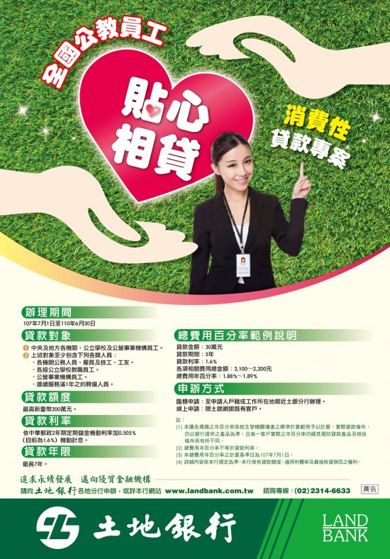 107年至110年「貼心相貸」-全國公教員工消費性貸款, 經行政院人事行政總處公開徵選,由臺灣土地銀行股份有 限公司(以下簡稱土地銀行)獲選賡續承作,請同仁參考運用。